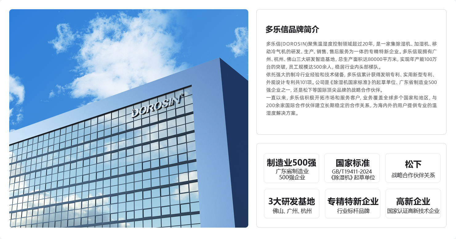 • 我们始终坚持,用精湛科技让工业生产变得更轻松。一直以来,多乐信通过平衡环境温度及湿度,帮助改善加工和生产条件, 营造舒适的工作和生活环境,创造理想的科研气候条件,为用户提供温湿度空气调节的整体解决方案。